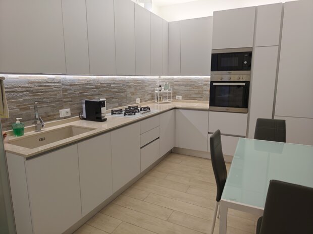 La zona giorno, luminosa e accogliente, si sviluppa sulla destra con un soggiorno di generose dimensioni dotato di due terrazze, una delle quali collegata direttamente all’ampia cucina abitabile. Un valore aggiunto per chi ama vivere la casa con convivialità.
